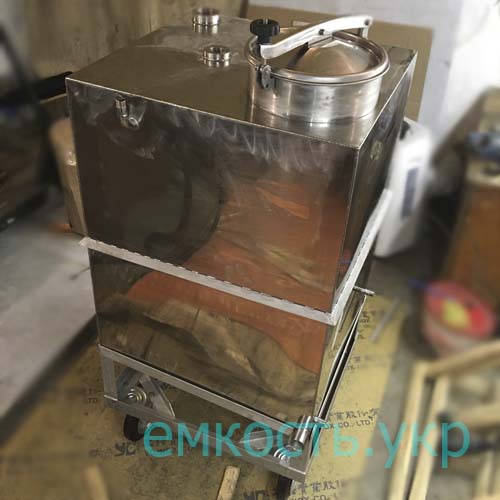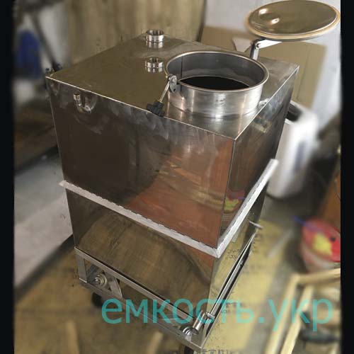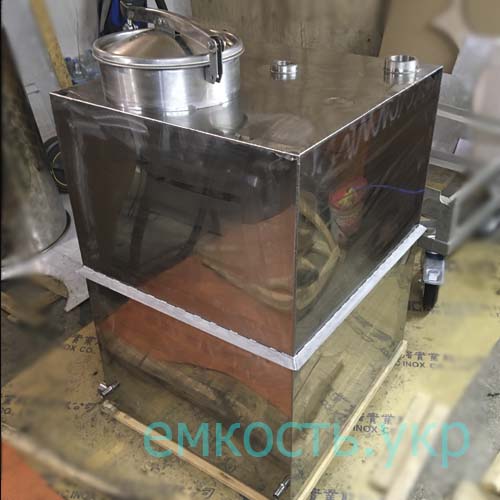 Бак с люком (диаметр 300 мм) из пищевой нержавейки AISI304 объемом 400 литров с скошенным дном в сторону слива, с размерами 650*700*950/900 мм толщина метала 2 мм. А также подставка под этот бак с уголка нержавеющего AISI304 комбиниронная (40*40*4 и 50*50*4 мм) высотой 430 мм.