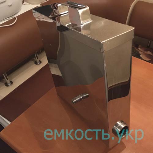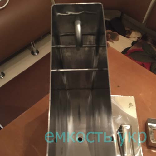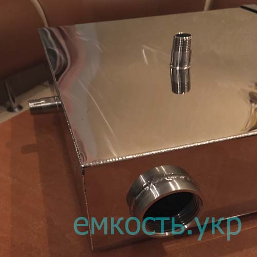 Бак с крышкой и штуцерами из пищевой нержавейки с размерами 400*400*100 мм, толщина метала от 1,2 мм до 2 мм.